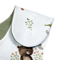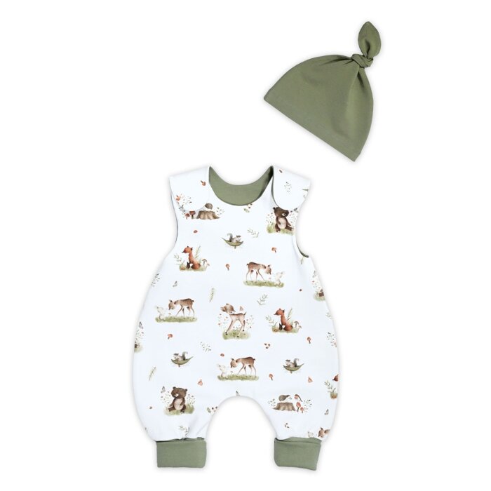 Entdecken Sie das zauberhafte Set mit niedlichen Waldfreunden, bestehend aus einem bezaubernden Strampler und einer passenden Knotenmütze in einem trendigen Olivgrün.