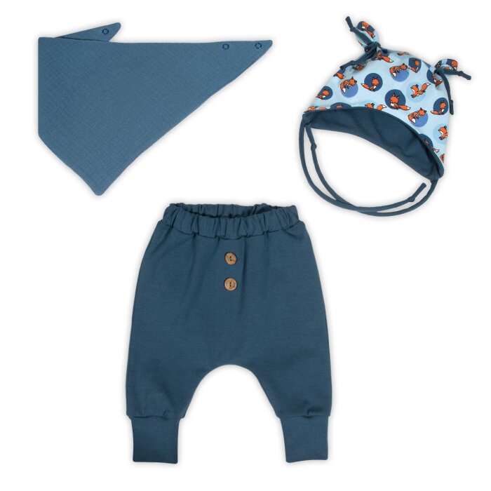 Das bezaubernde Geschenk-Set für kleine Jungen besteht aus einer Babyhose, einer Ohrenmütze und einem Halstuch – perfekt für die Kleinsten! Der niedliche Fuchs-Print auf hellblauem Stoff sorgt für einen liebenswerten Look. Hergestellt in liebevoller Handarbeit aus hochwertigem Baumwolljersey (für die Hose und Mütze) und weichem Musselin (für das Tuch), sind die Materialien besonders weich, anschmiegsam und atmungsaktiv – ideal für zarte Babyhaut.